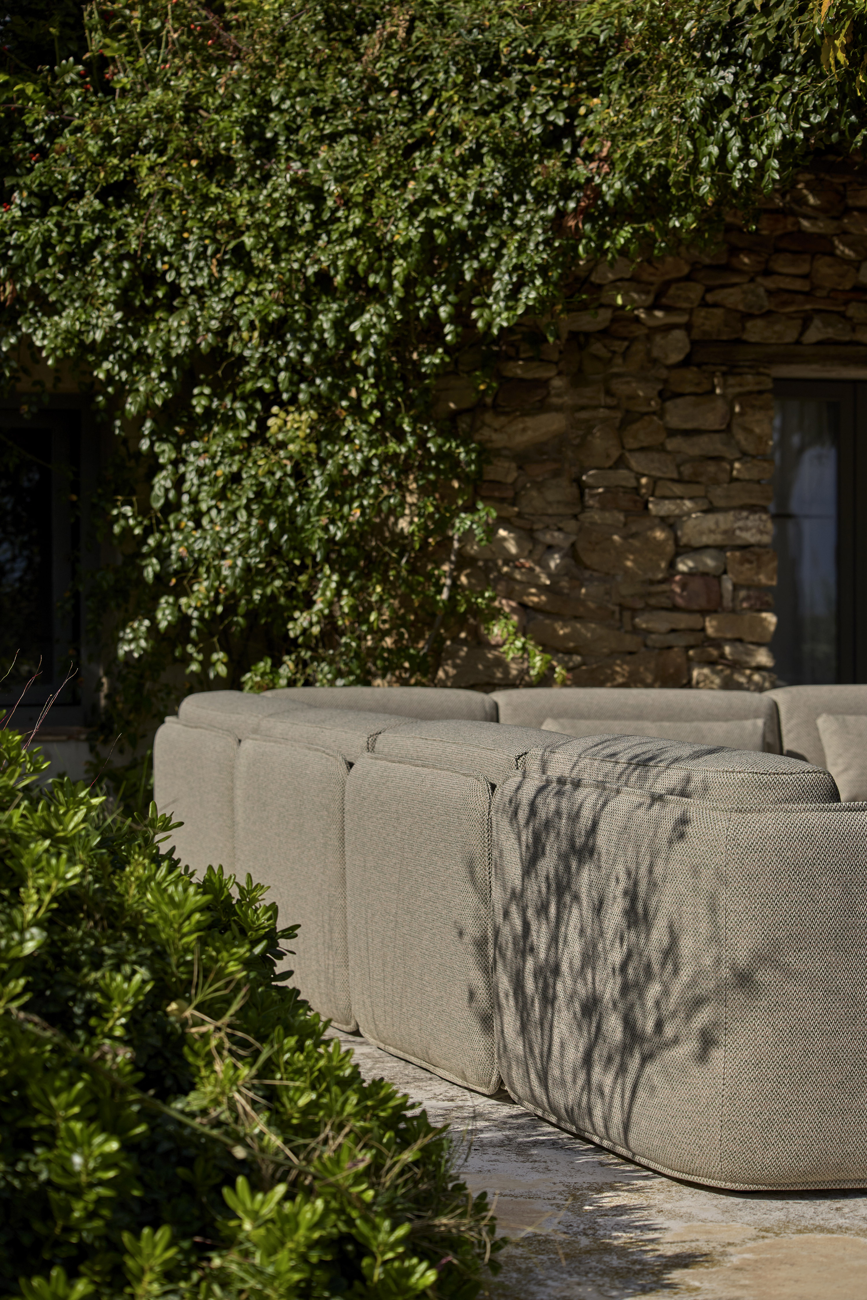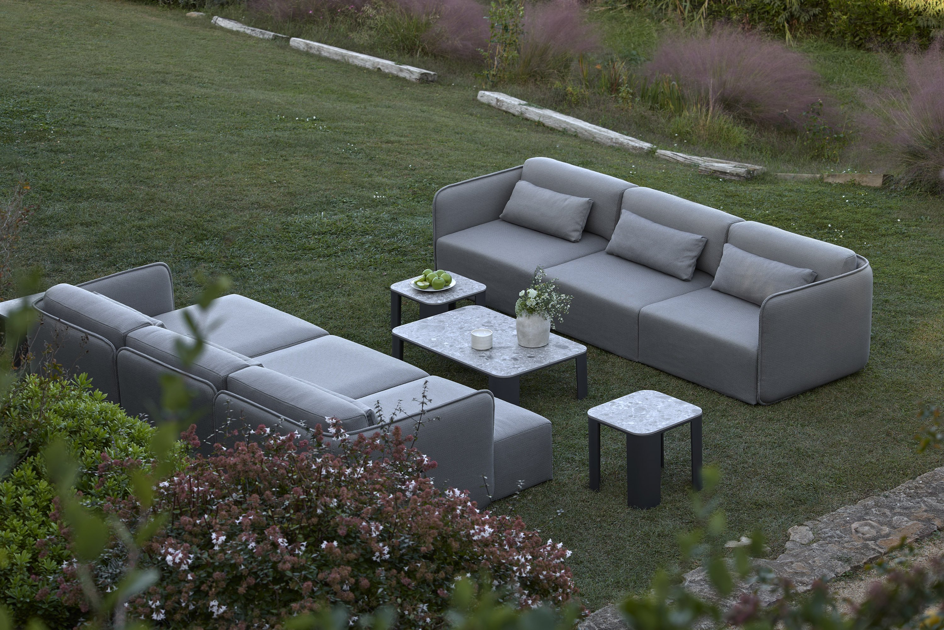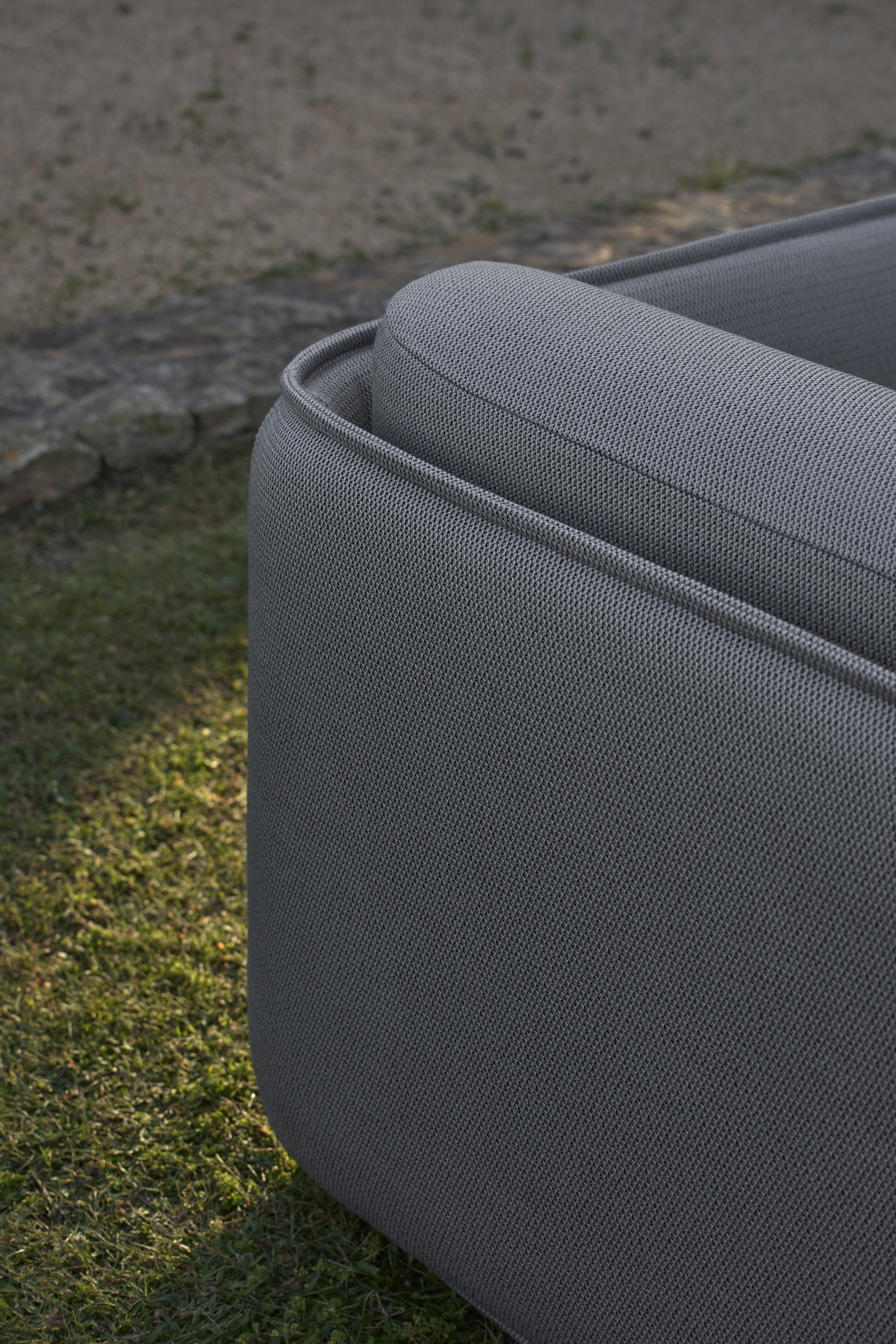 The arms and continuous backrest of the pieces form a single organic body, upholstered with specific fabrics for outdoors, with a double cover. The fabric is finished with a characteristic visible seam that represents the inviting nature of the collection. The structure is aluminium.