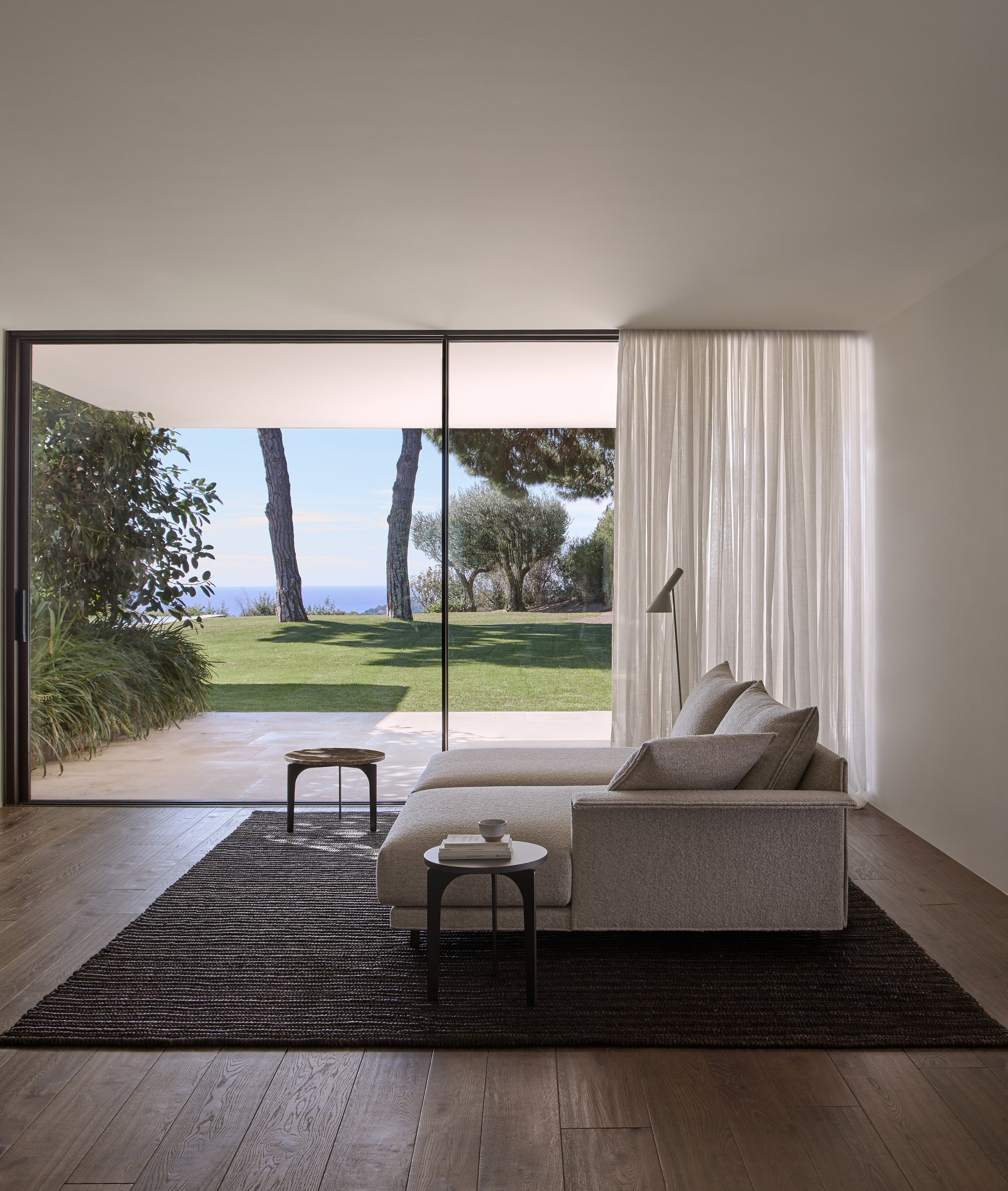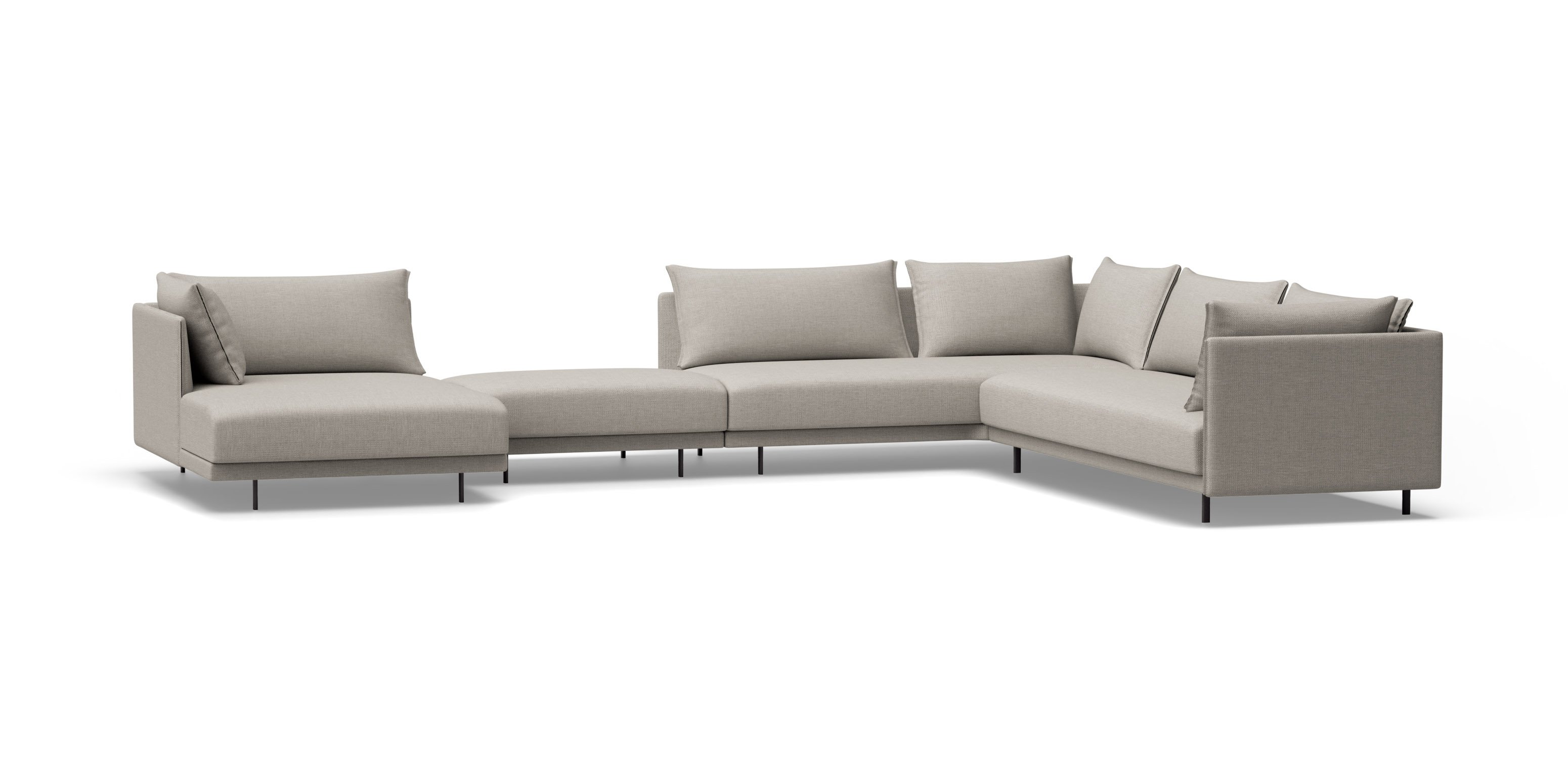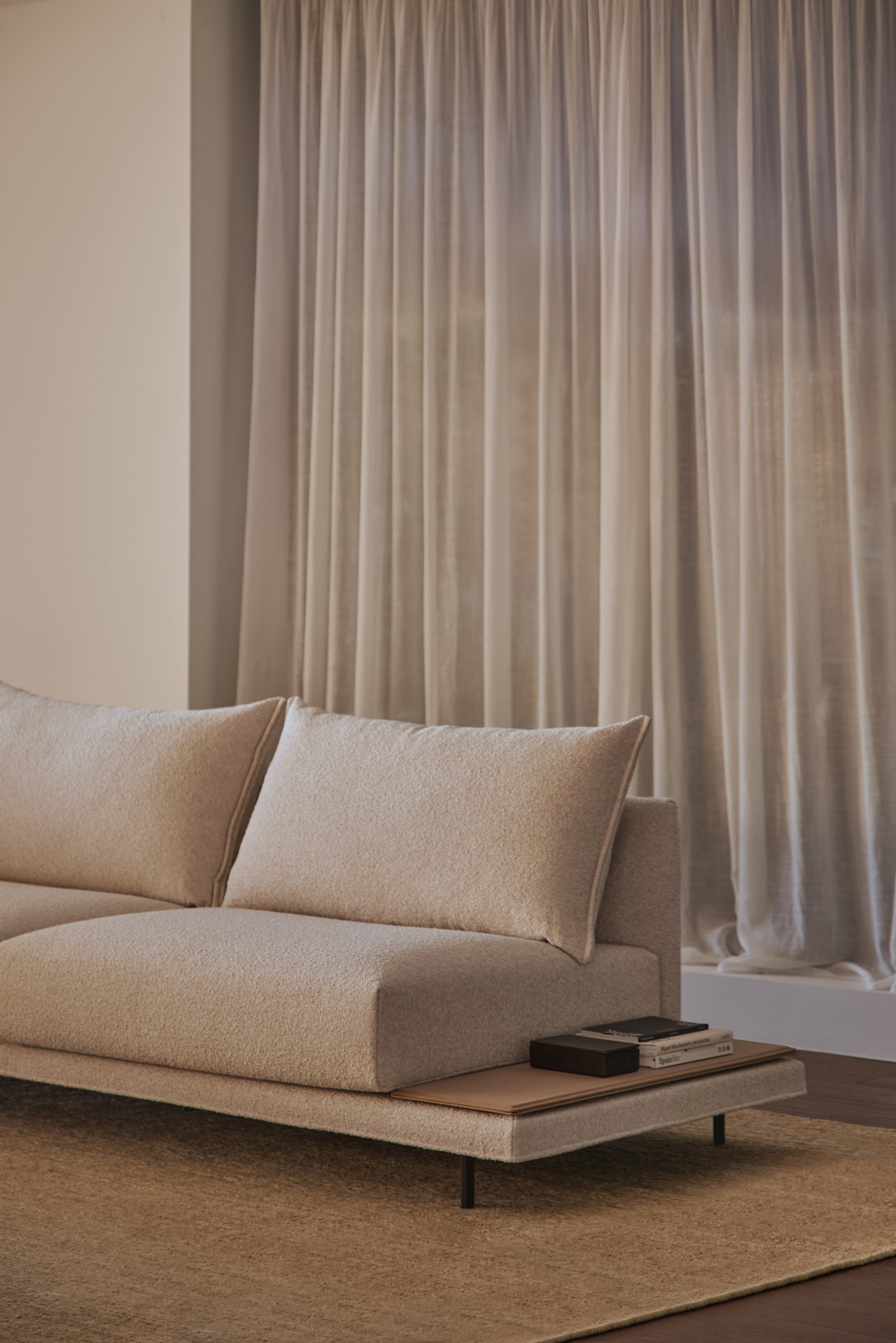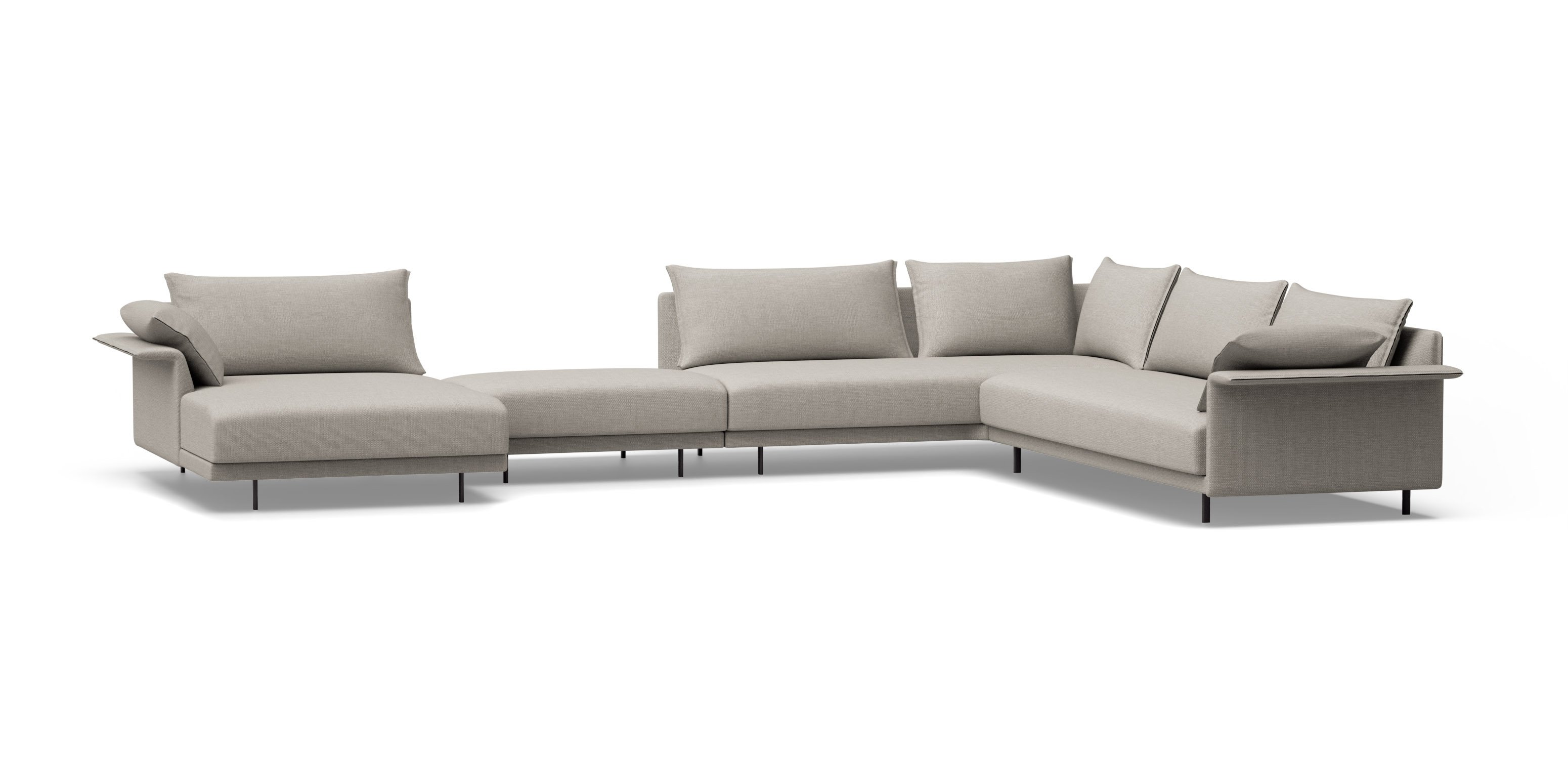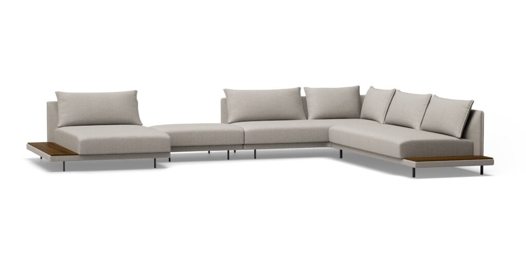 Système de structure rembourrée avec bases suspendues sur pieds métalliques. Le système se compose de modules de différentes tailles et formes : chaise longue, péninsules, pouf, etc. Trois options de conception des accoudoirs (hauts, bas ou en forme de L) ou version avec plateau intégré à la structure à la place de l’accoudoir, dans différents matériaux au choix. Les sièges peuvent être configurés avec plusieurs coussins ou avec un seul coussin.
