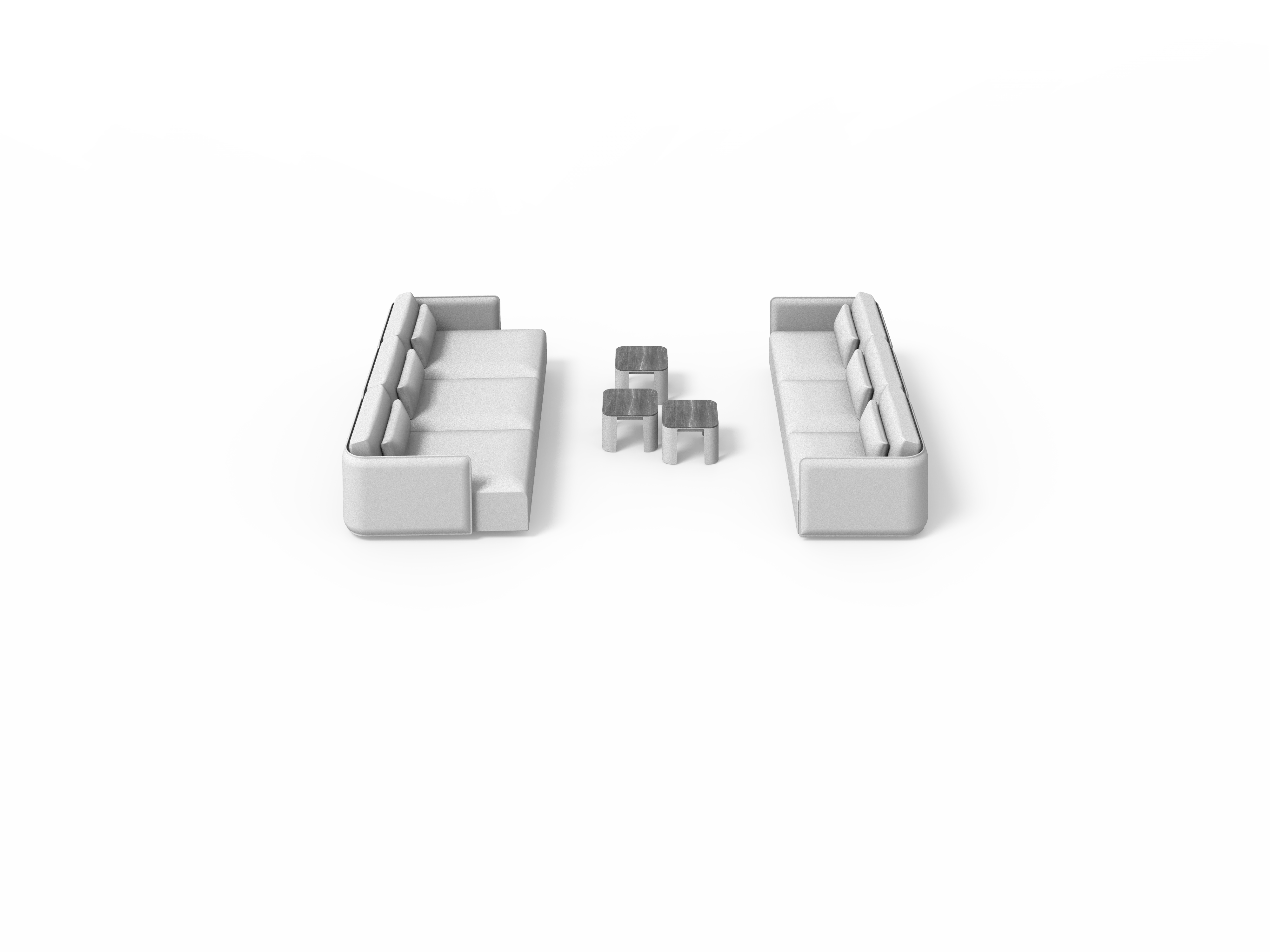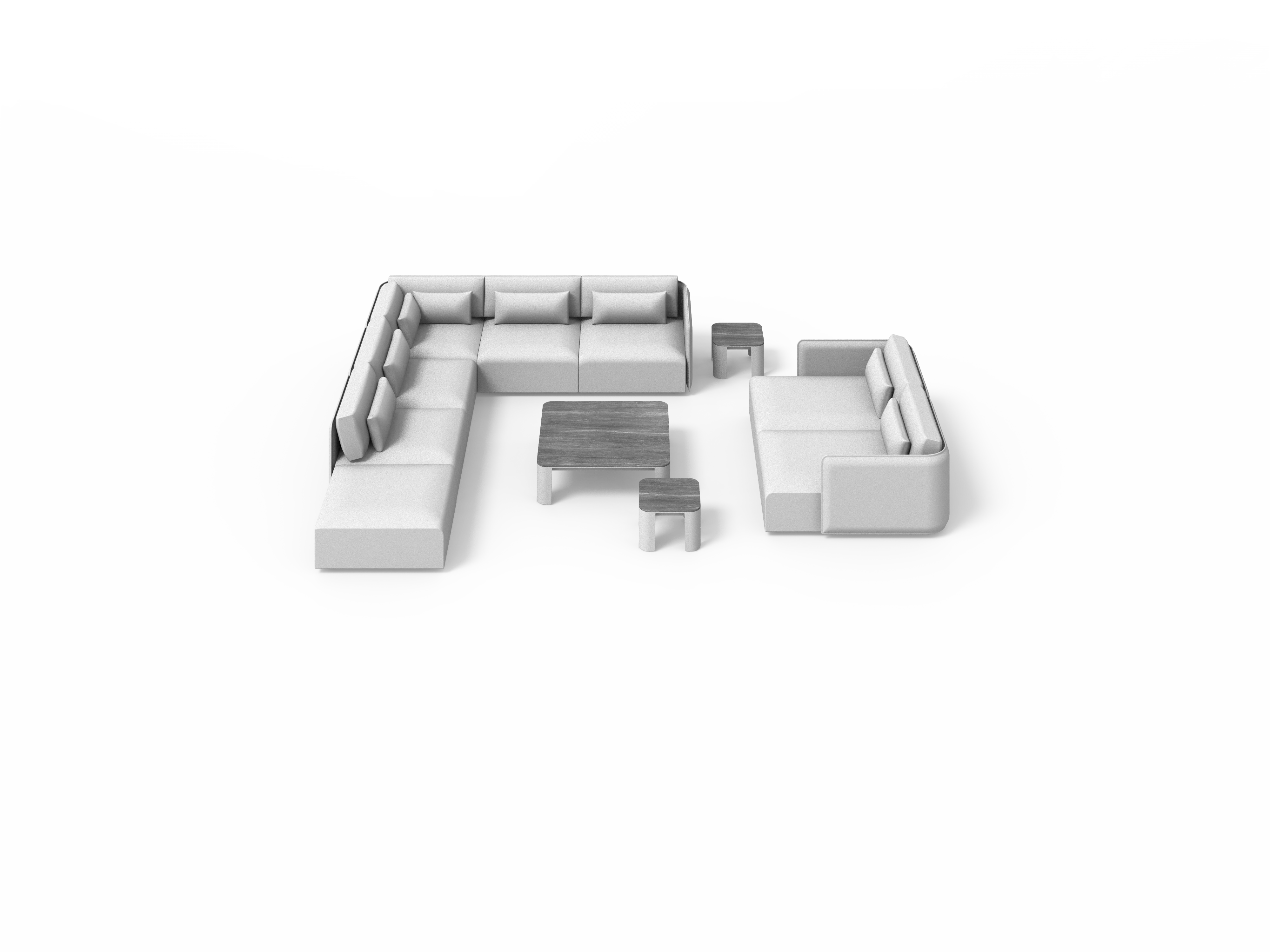 Colección de sofás y sistema de exterior construidos con estructura de aluminio y una pieza única de respaldo y brazos continuos. Todos los elementos tapizados llevan tejidos específicamente creados para su resistencia a la intemperie.