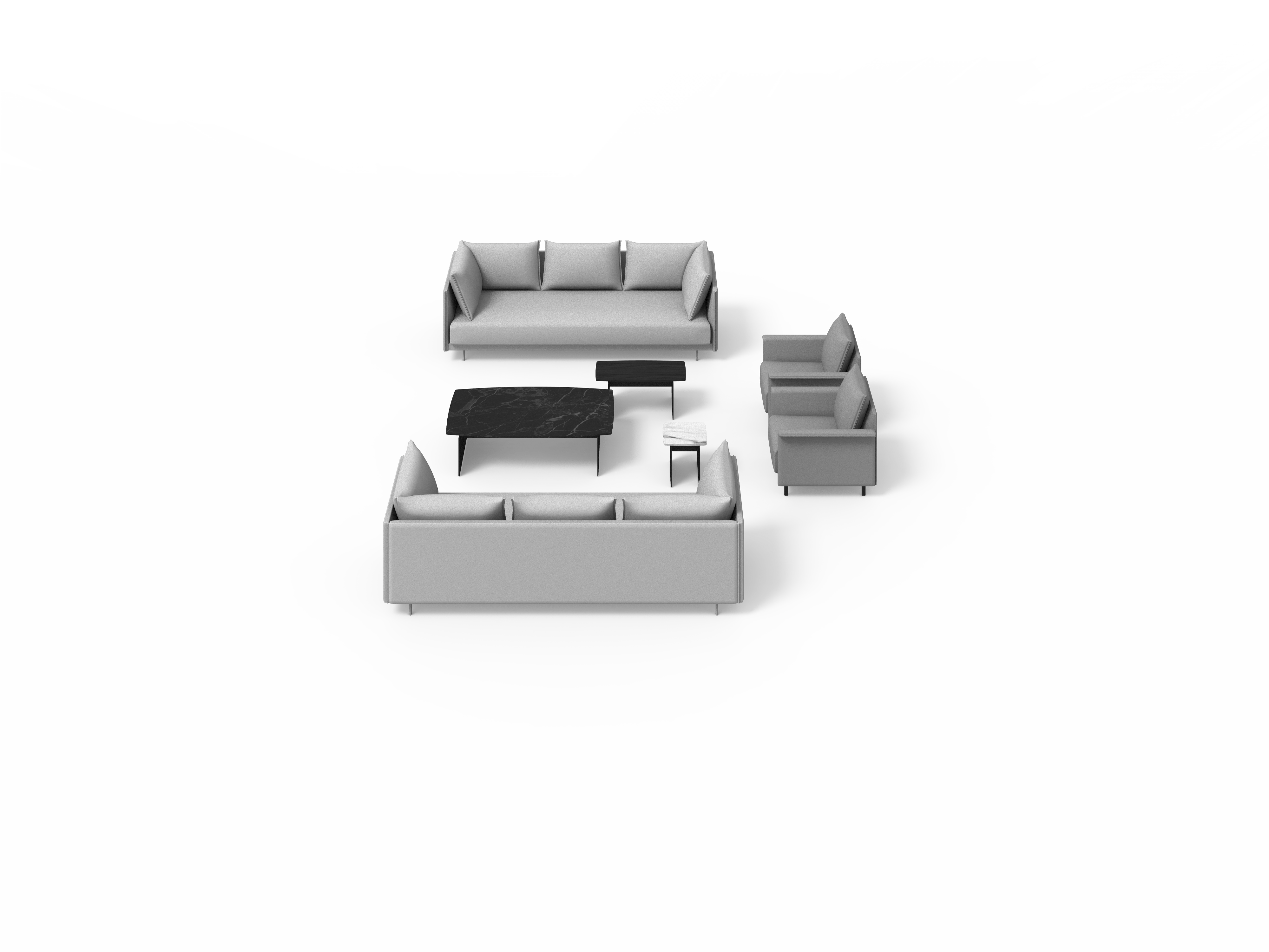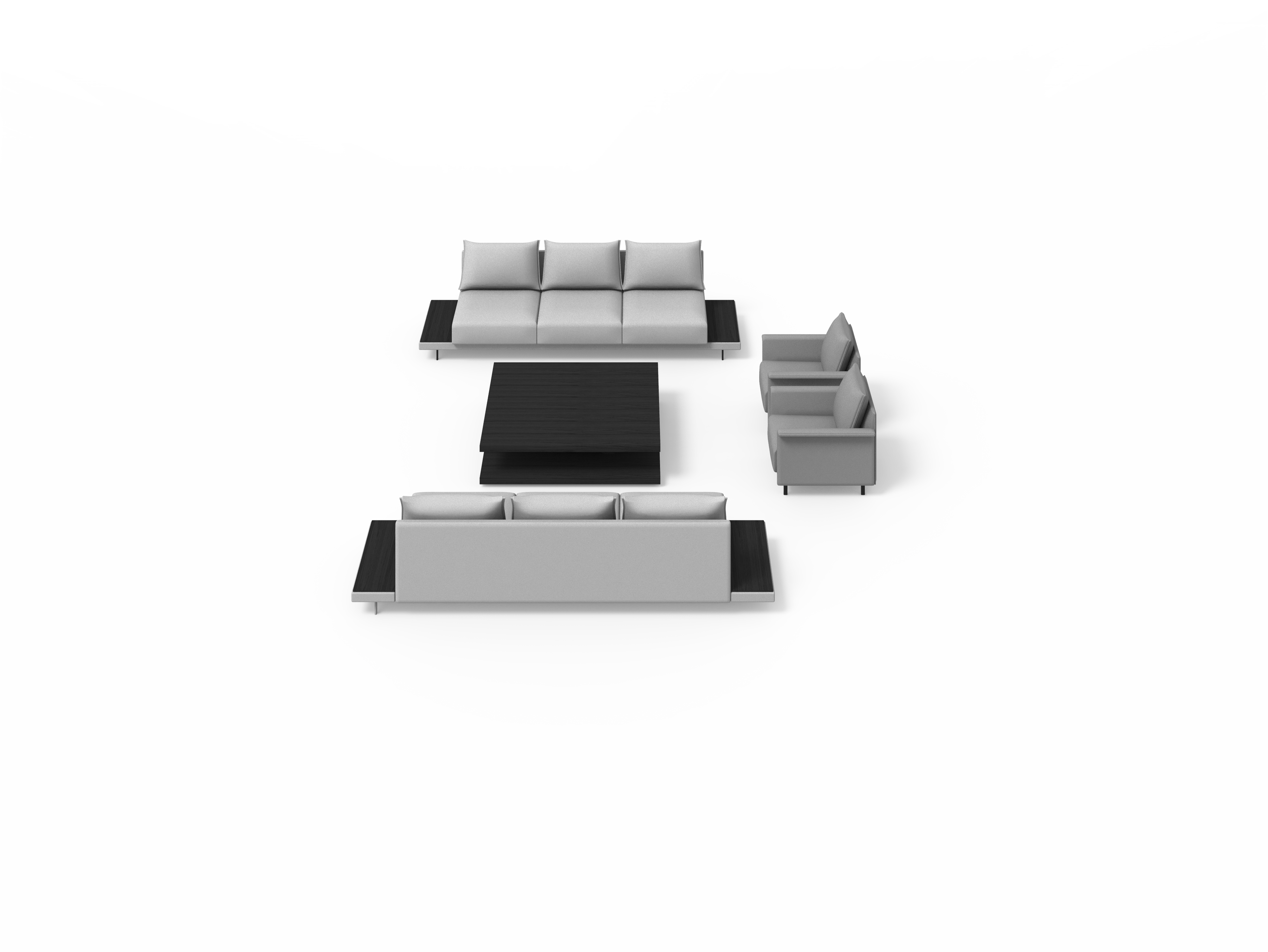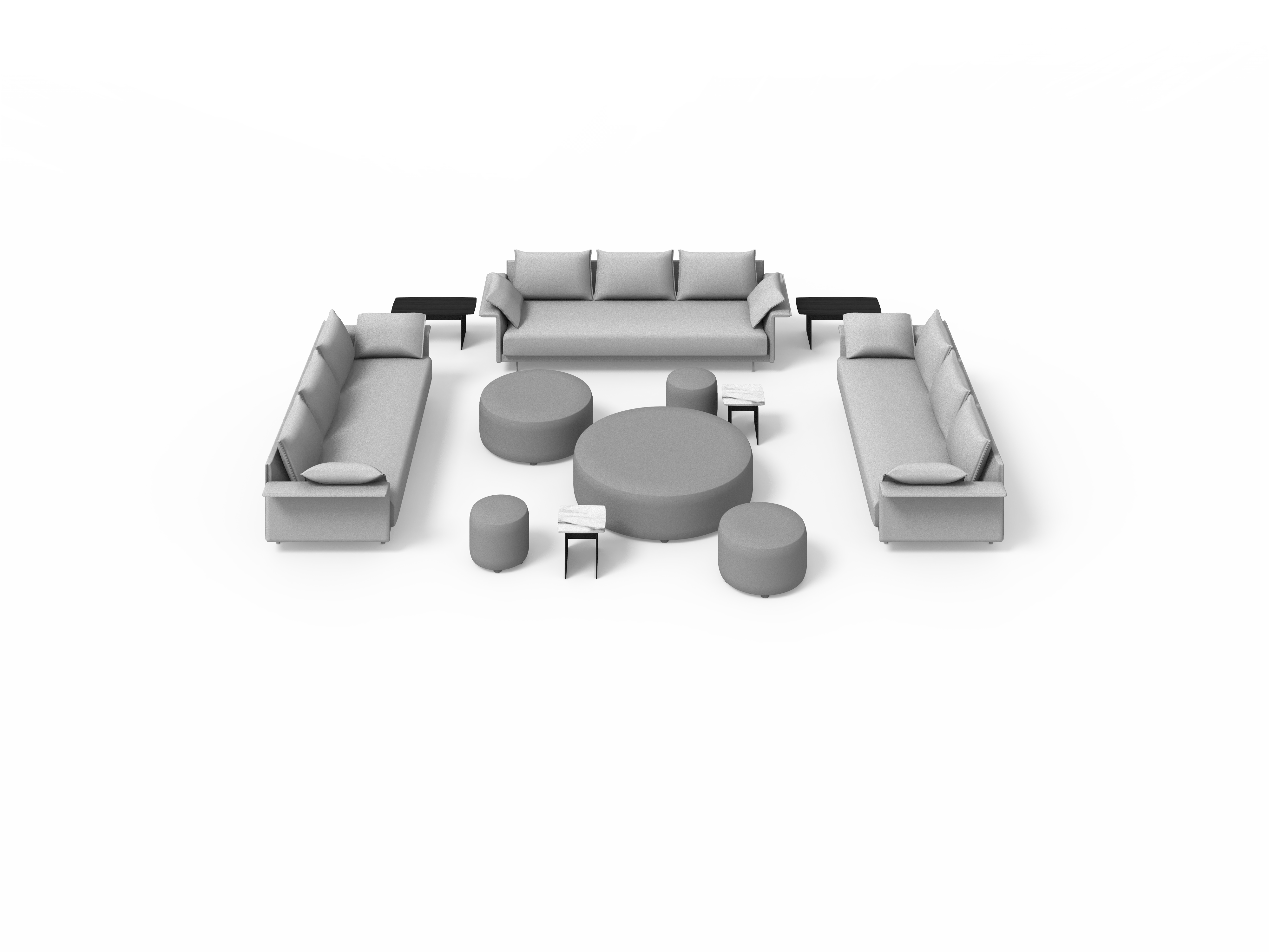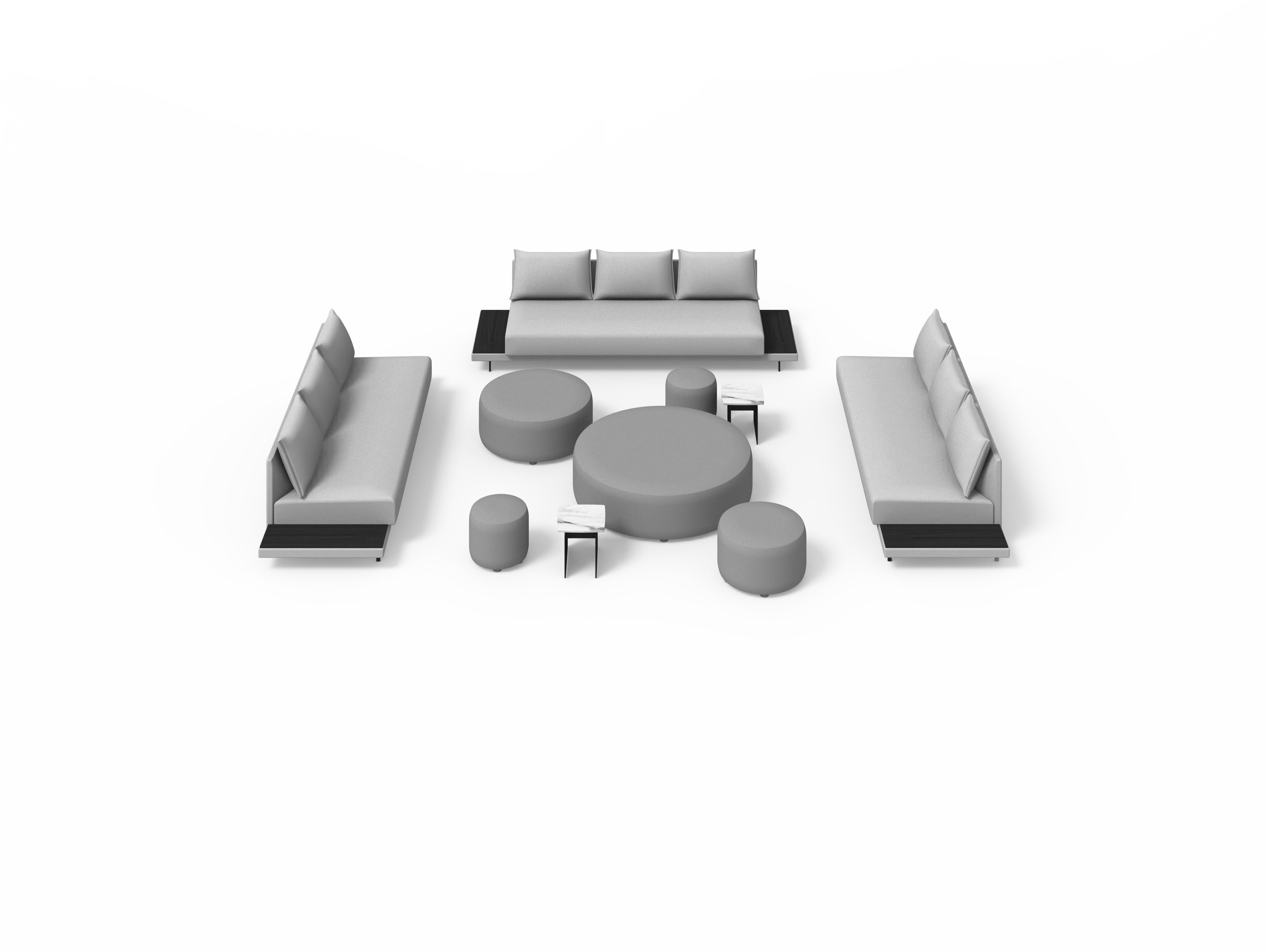 Sistema de estructura tapizada con bases suspendidas sobre patas metálicas. El sistema está compuesto por módulos de diferentes tamaños y formas: chaise-longue, penínsulas, puf, etc. Tres opciones de diseño de brazos (alto, bajo o en forma de L) o bien versión de bandeja integrada en la estructura en lugar de brazo, en diferentes materiales a elegir. Los asientos se pueden configurar con varios cojines o con un cojín único.