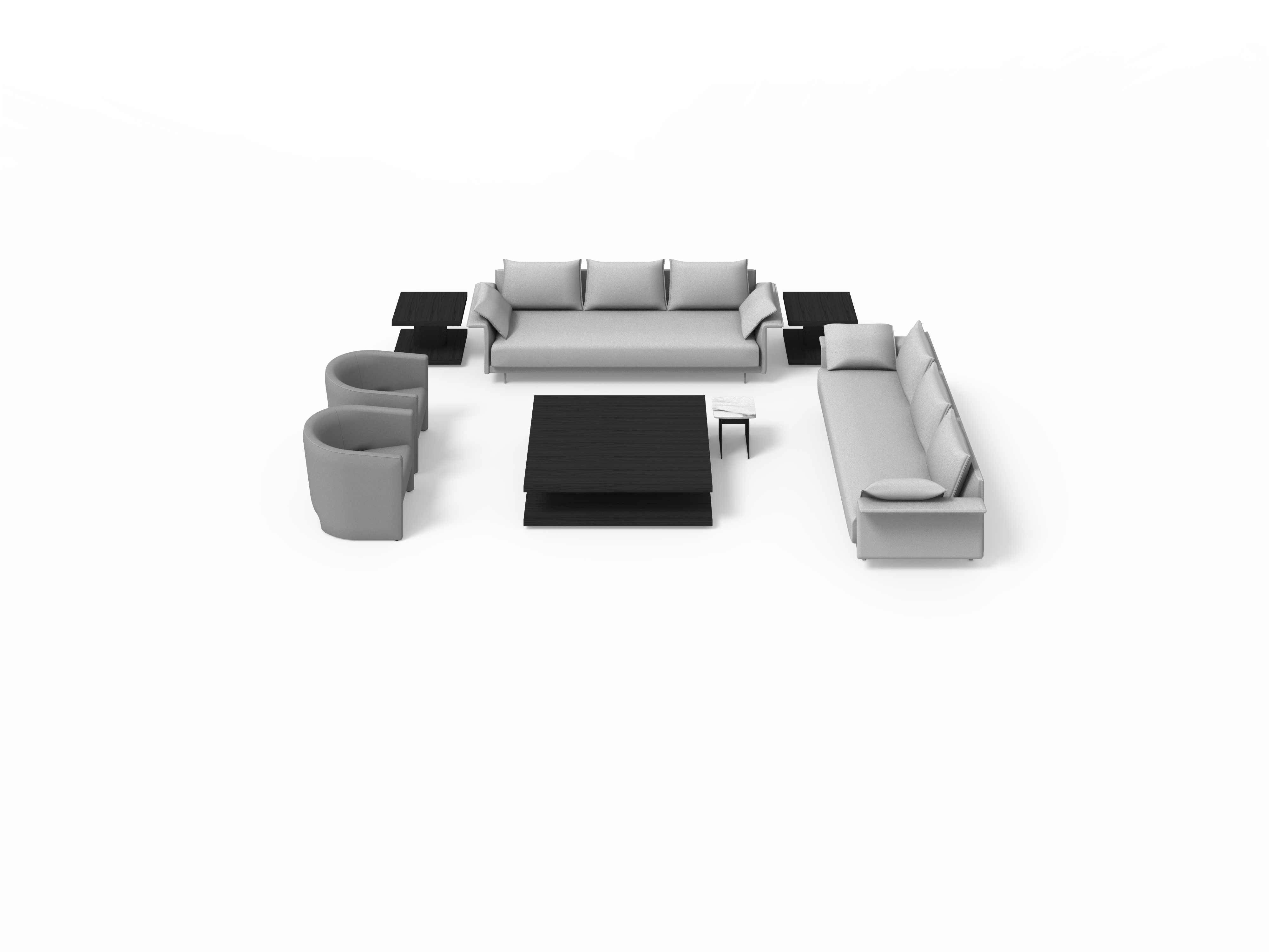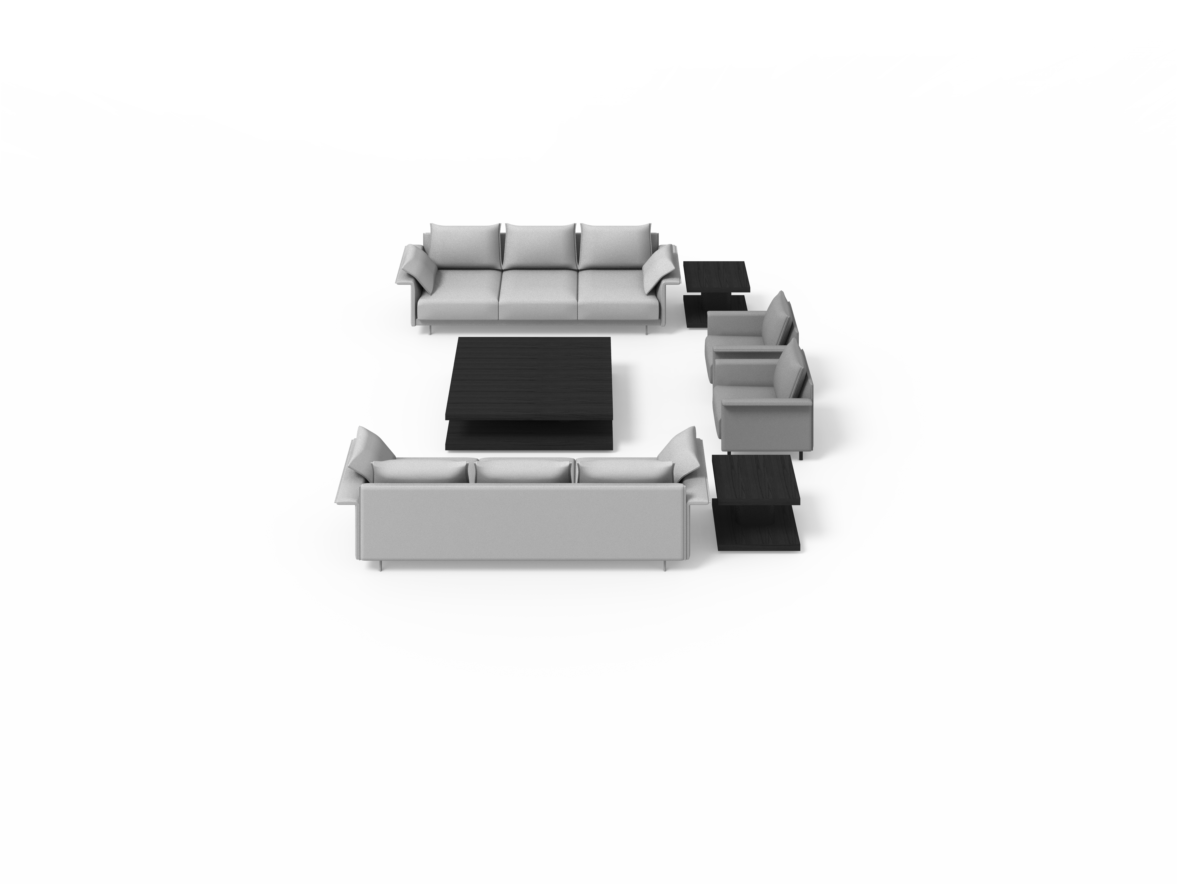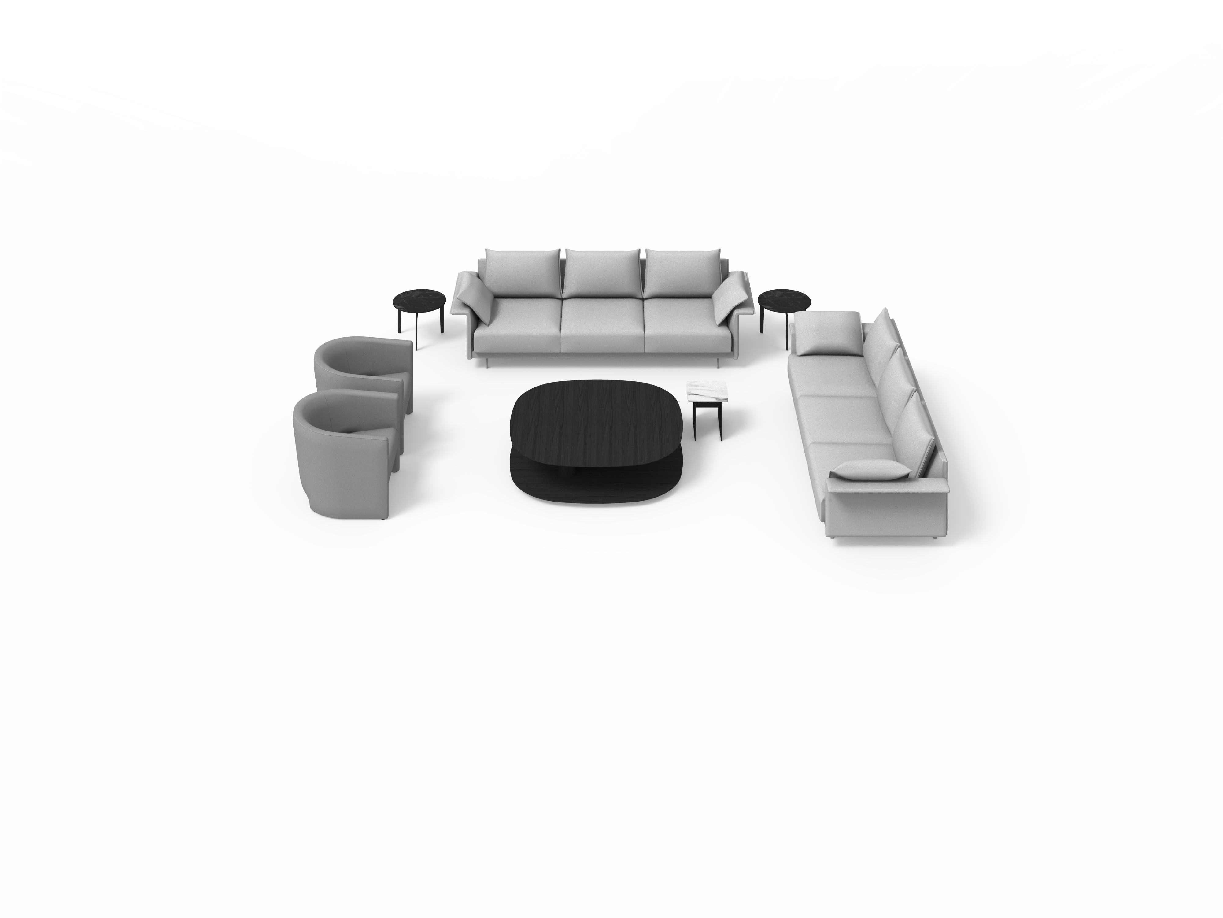 Sistema de estructura tapizada con bases suspendidas sobre patas metálicas. El sistema está compuesto por módulos de diferentes tamaños y formas: chaise-longue, penínsulas, puf, etc. Tres opciones de diseño de brazos (alto, bajo o en forma de L) o bien versión de bandeja integrada en la estructura en lugar de brazo, en diferentes materiales a elegir. Los asientos se pueden configurar con varios cojines o con un cojín único.