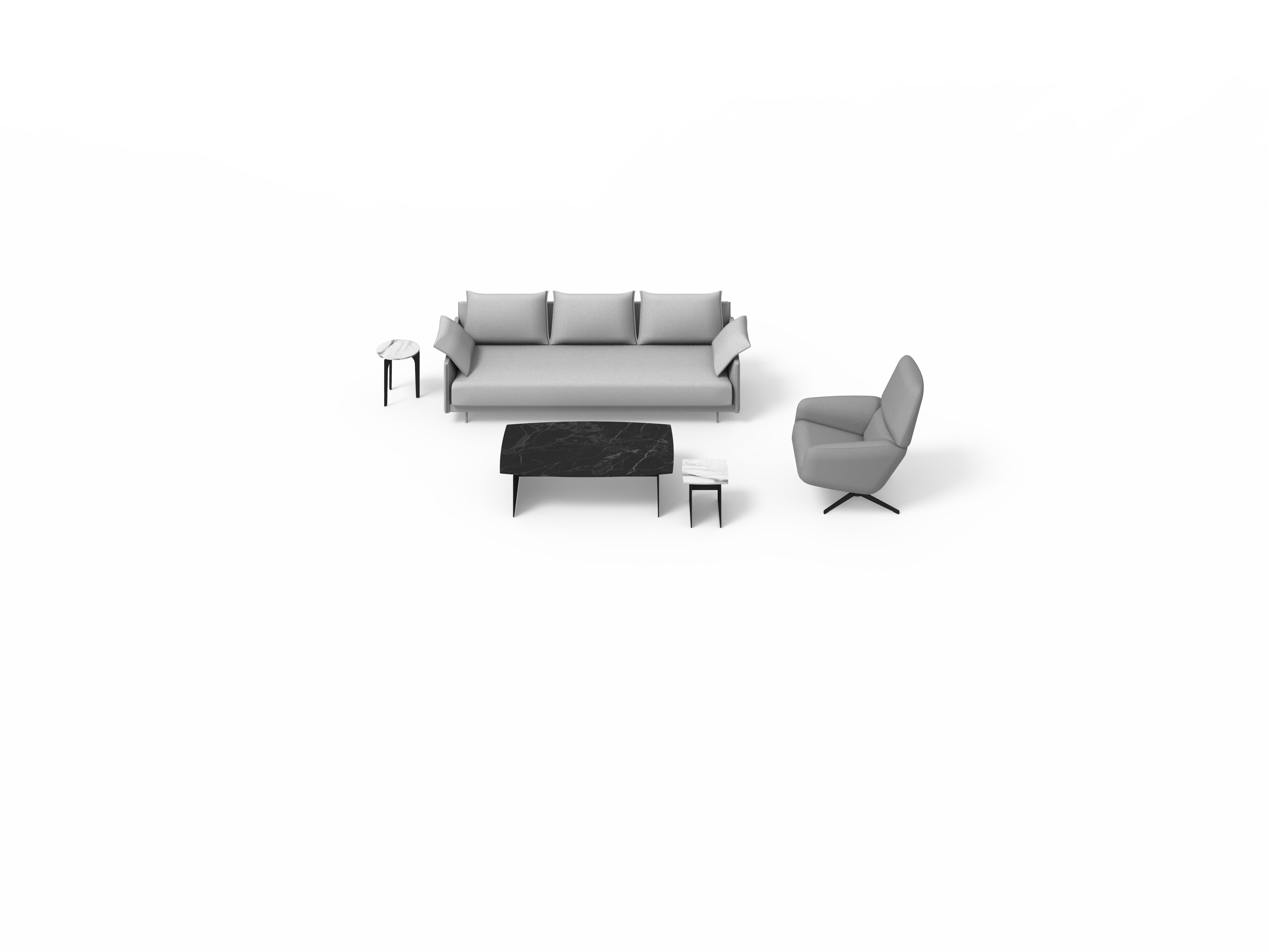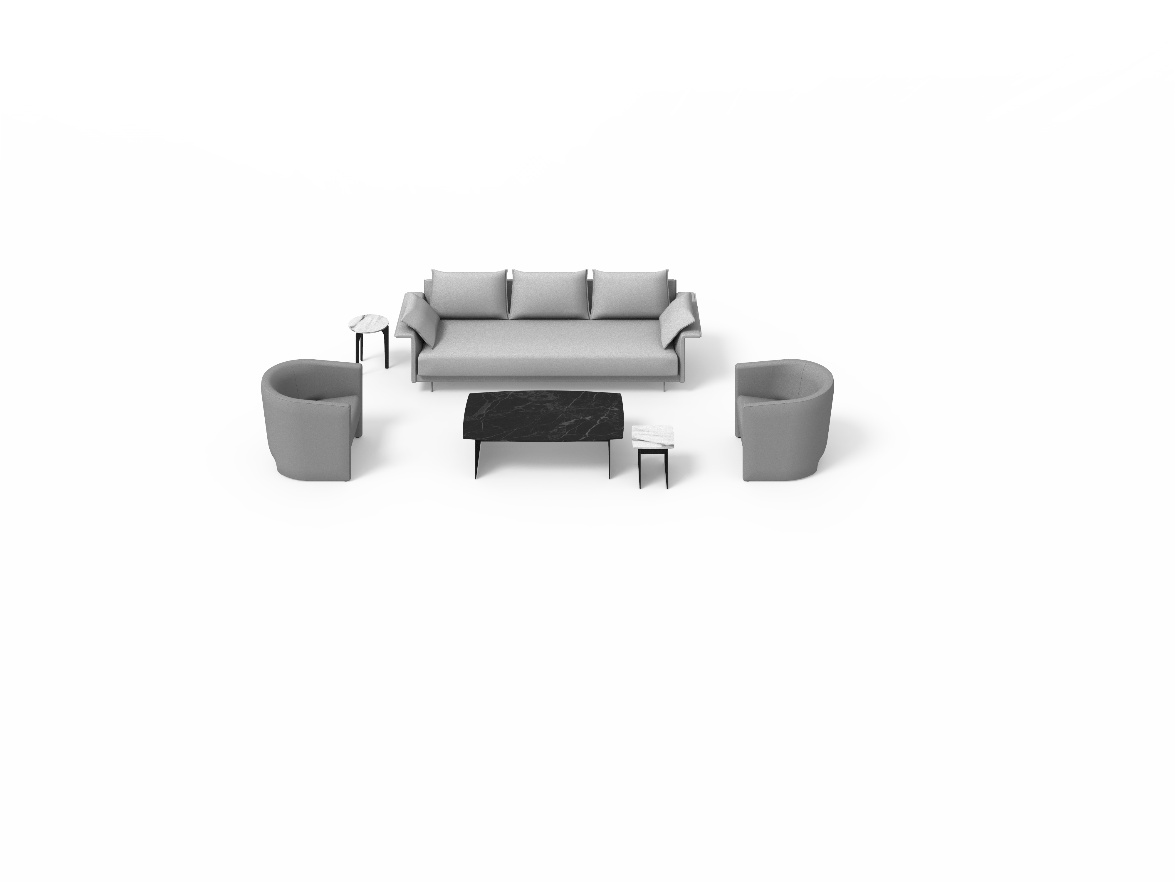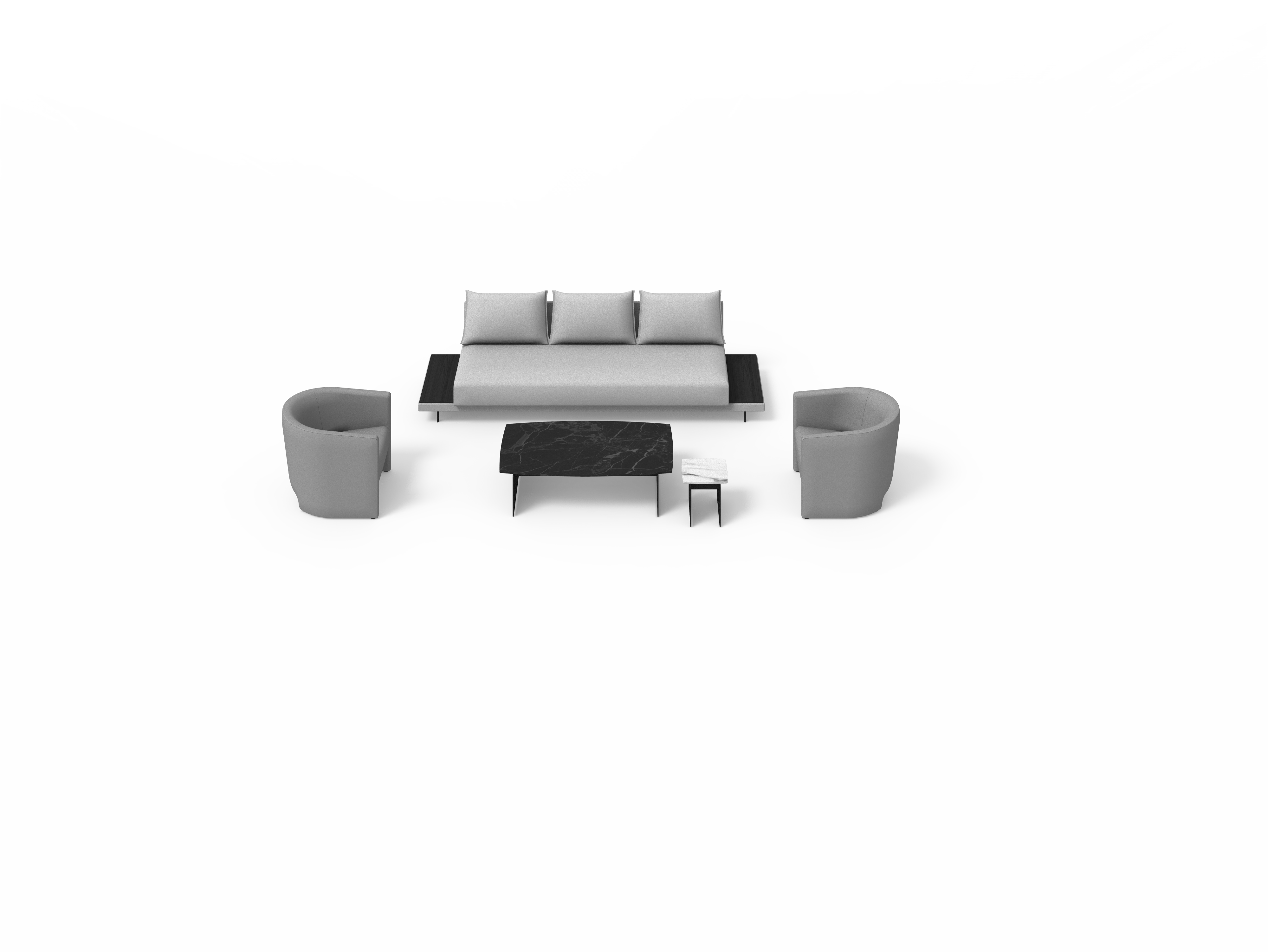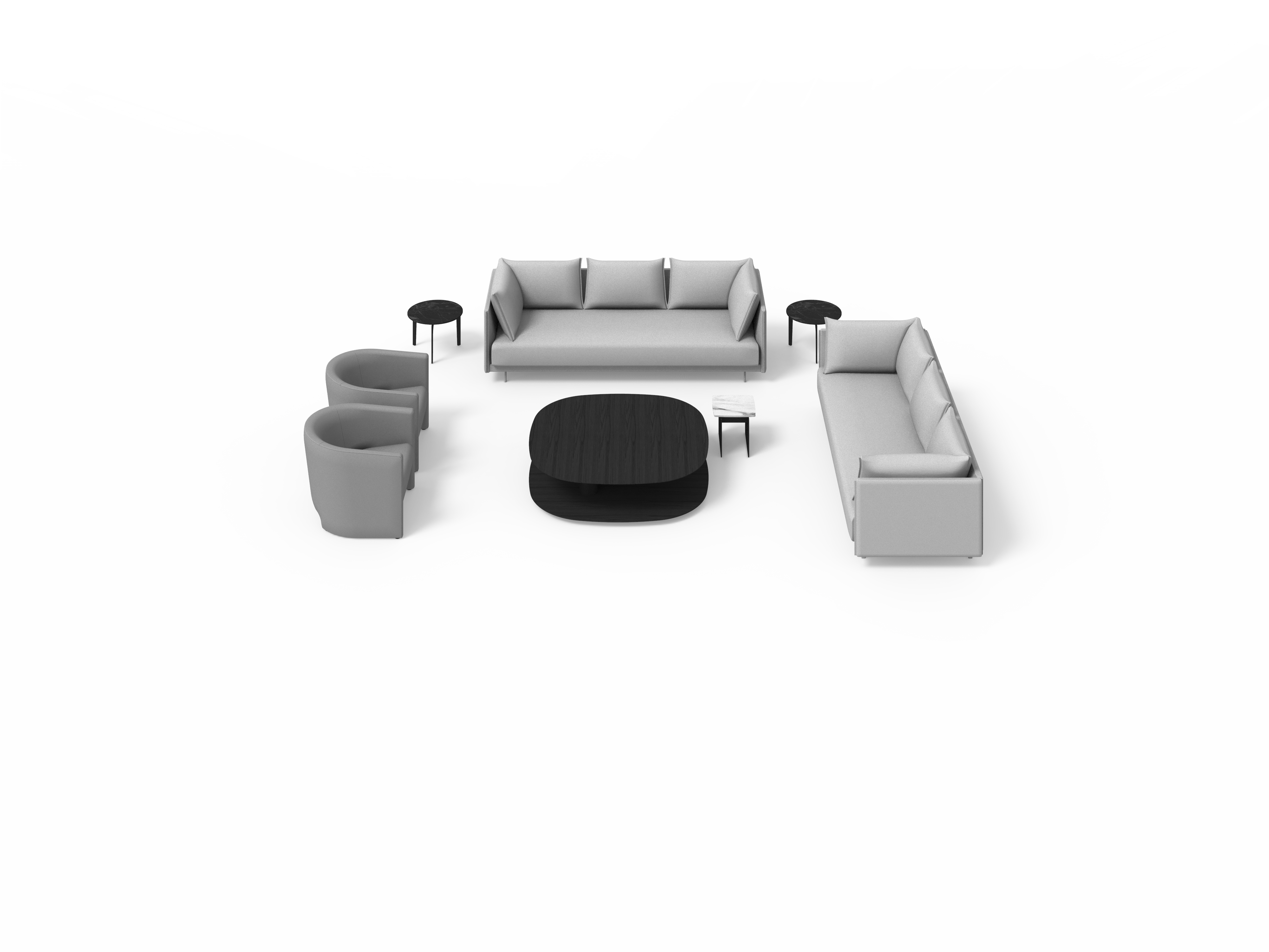 Sistema de estructura tapizada con bases suspendidas sobre patas metálicas. El sistema está compuesto por módulos de diferentes tamaños y formas: chaise-longue, penínsulas, puf, etc. Tres opciones de diseño de brazos (alto, bajo o en forma de L) o bien versión de bandeja integrada en la estructura en lugar de brazo, en diferentes materiales a elegir. Los asientos se pueden configurar con varios cojines o con un cojín único.